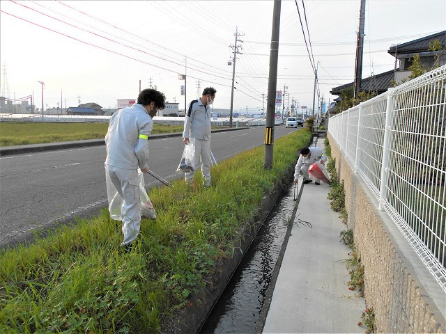 車に気を付けつつ、会社脇を流れる用水路も清掃しました。